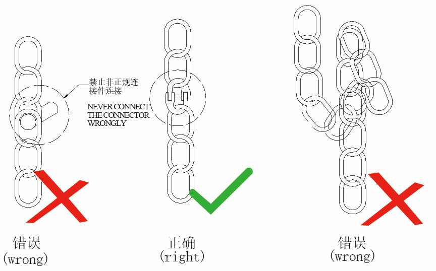 2、使用链条索具时,要选择正确的连接方式,不得扭曲,搭接使用。